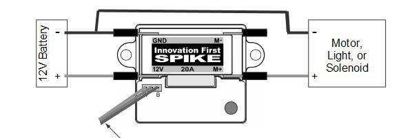 If you want to continue using the Spike Relay and just stop it from reversing the polarity. You simply need to modify your PWM wire. 1. Cut the Red/Middle wire, leaving ~2 inches of the wire on the Relay side. 2. Cut the Black/Ground wire at about the same place. 3. Strip the red wire on the Relay side, and both of the Black ends. 5. Put heatshrink on the long black wire, and solder the three ends together. 6. Slide heatshrink over solder joint and apply heat. The M- pin will now always be grounded, and by setting the relay forward/off in the code you can change M+ to +12v or GND, however if you set the relay to reverse, you will get GND on both pins because the middle pin is still pulled to (-). Here is the spike User Guide that give info on how the input to the Spike works: http://content.vexrobotics.com/docs/...uide-sep05.pdf |