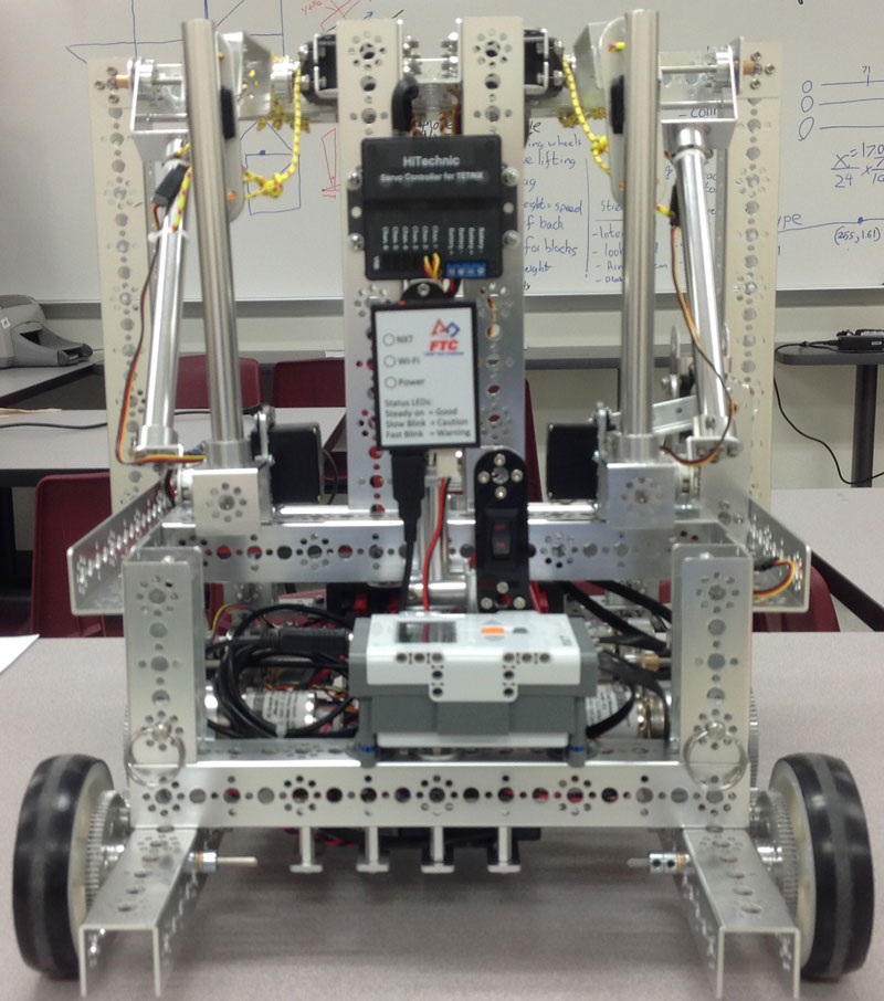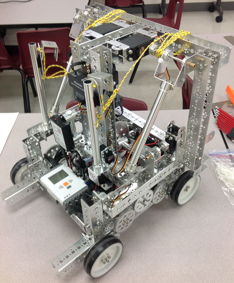 Our team uses a 6-wheel drive system, using 4 TETRIX V2 motors, 2 on each side, and each side connected to one motor port on the controllers. We have 120 tooth gears on the motors, and 80 tooth gears on each wheel, which drives rather quick. (You can kind of see it in the picture) We had to put steel weights in the bottom of our robot to counteract all the torque, making it weigh 38 pounds. It's no fun to carry it to the competition field. https://s3.amazonaws.com/ksr/assets/...G?1390610 304