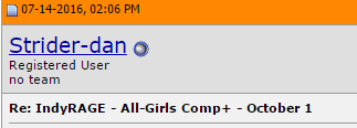 ![]() As per the Re: IndyRAGE - All-Girls Comp+ - October 1 line you can obviously see what the original thread was. With this being said i'm extremely irked by the traction that this "moderator censorship" movement has gained. Just seems like a large sum of individuals are those that are looking to gain some repute within the community trying to gain repute from thin air. The moderation team is doing a fabulous job. They have done so for a long time now. |