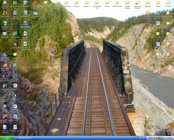 ![]() My background image is a picture of a watertower that I found on a computer at the local community college. I messed with the color and things and came up with the background. The calendar is a program called Rainlendar. My huge ToDo list is also there. I also try to keep my desktop icons somewhat organized. |