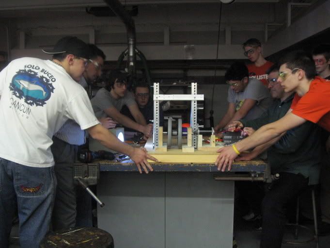bam! 12 feet per second. this launcher is pretty awesome. and EXTREMELY accurate (spray range average of about 5 inches) unbounded we got the launcher to shoot at a maximum of 25 feet per second. so this thing is dangerously powerfull (we even went and fired it at the principal of the school, and OF COARSE he volunteered) it really stinks that we havent been able to get our closed loop to work, the sensors seem to like to return null values :) and the camera? *shiver* we have gotten pretty far along as far as planning goes, and we have a separate team of brainiacs (non-programmer/building but smart types) who are contemplating the posible strategies. im hoping for a good competion seaon this year! (i hope i stayed on topic.... im not really good at that as my english papers would say) EDIT: hey spiffizzle... keep going on that design. it looks really nice so far. |