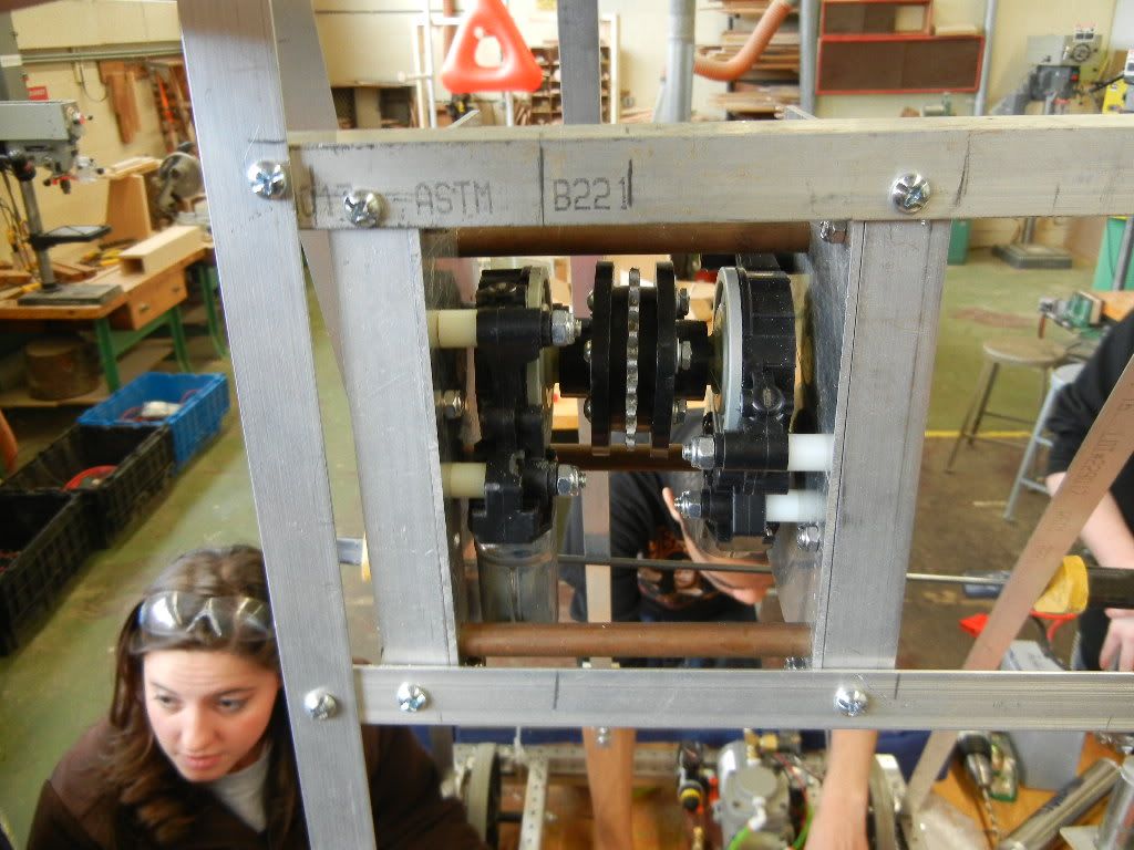 So we did a bunch of work today and got to drive the robot around a bit. Turns out the window motor overheats pretty quickly running the arm. We are currently using bungie cords, but we might have to use surgical tubing or something else instead. Yesterday we found the big sprocket on the arm was getting pulled out of alignment as it turned the arm. So today we added brackets to keep that from happening. the problem is the arm ballooned out to 28 pounds. We did some major cutting on the brackets and got it down to 26. The brackets are made from 1/4 inch thick aluminum. (all we had left) We will be ordering some 1/8 inch thick aluminum to replace them with.