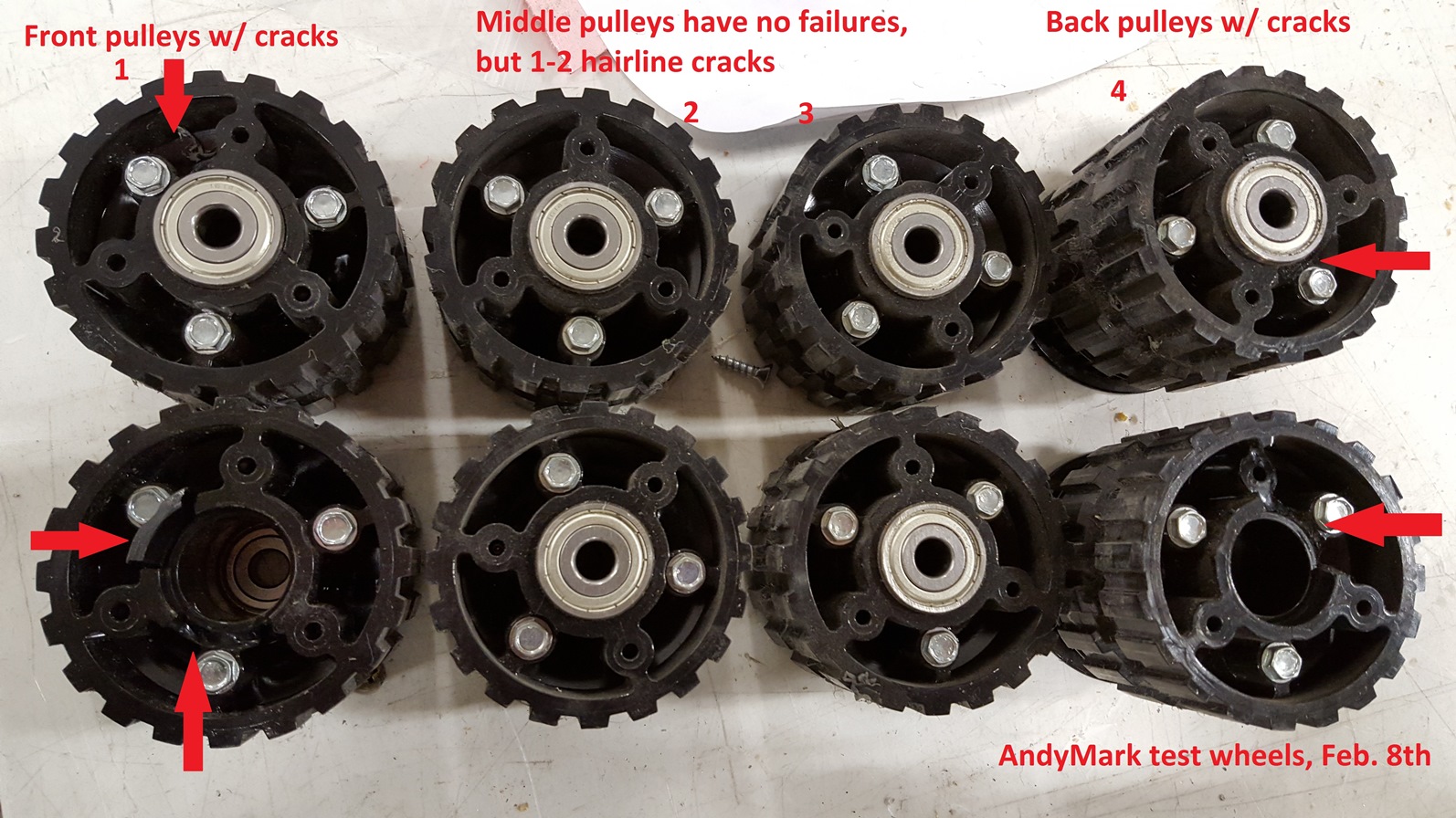 We have a test mule here at AndyMark that has been tested many times. Our initial tests (before kickoff) did not show cracking. We drove this mule over the wooden defenses after kickoff and it seemed to do fine. As it drove more last week, seemed to have more resistance to driving the tread. Today, when we drove it, the 120a breaker tripped. We took it apart and found that there were pulley fractures on both sides, on pulleys 1 and 4. Pulleys 2 and 3 did not have fractures. They had a few hairline cracks, but nothing was wrong with pulleys 2 and 3 to affect performance. Here is a picture of our pulleys we took off today: