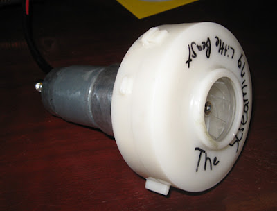 Here are two pictures of our turbine. It is a Dirt Devil hand held vacuum modified to fit a Fisher-Price motor with a 1:2 gear ratio. This assembly is attached to a 20" diameter dome.
