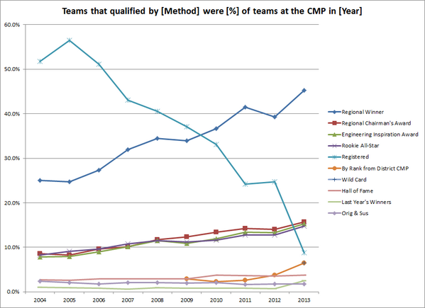 I attached a second graph (qualification methods grouped) because it shows another interesting trend. Up until two years ago, there were about as many culture-changing teams as teams that qualified using their robot. In the past two years, the % of "robot teams" at the CMP has quickly outpaced "culture teams." The causes for this are obvious, but the effect is quite dramatic. |