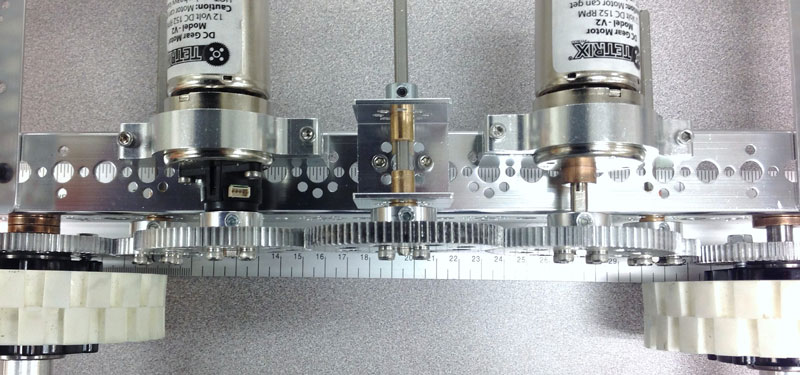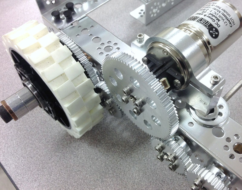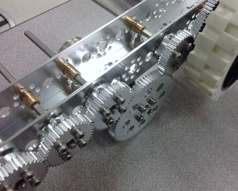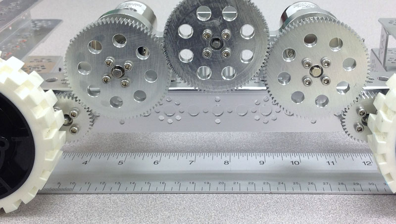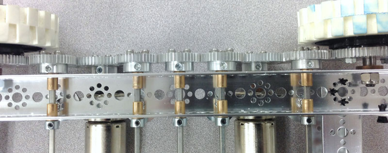 1. Replaced the 3 40T center gears and their axles with one 80T. This also allowed us to eliminate the spacers under the motor mounts and gave us some adjustment range between the two motor gears and the driven gears. This drive train runs smoother and feels "right". 2. Wheel base increased from our original 10" to 11.25". We tried eliminating the remaining two small gears (the next increment smaller) but couldn't get the gears to mesh correctly. I'm okay with the increase. 3. I think the larger gears might run a little truer when all four bolts are used on their hubs. I don't think it matters with the 40T gear. ![]() ![]() ![]() ![]() ![]() |