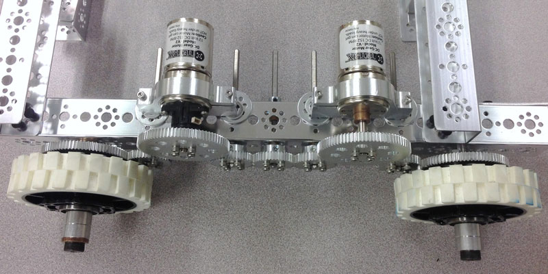 Two mirrored assemblies: Left Side Drive & Right Side Drive Parts list for ONE Assembly: 2 wheels with bearings and axles 2 DC motors and mounts 1/2 Motor Controller 1 Encoder 2 Wheel Gears, one per wheel with axle and hub 2 Motor Gears, one per motor with motor hub TBD Gears as needed to connect the gears attached to the 2 motors and 2 wheels into one meshed drive train Wire both the motors onto the SAME Motor Controller Port. Final gear ratio is determined by wheel gear/motor gear. Size of intermediate gears does not matter. Make note that each intermediate gear reverses the direction. QUESTIONS/ASSUMPTIONS 1.Can we run all four motors off one motor controller, ganging them up two motors per port? We can borrow another motor controller. CAREFUL of the wiring! 2. Is it better to mount the motors closer to the ends near the wheels or put them in the center near each other and drive gears out to the wheels? 3. I'm assuming the fewer intermediate gears the better? Now I see how you could have the six wheel configurations with the two motor per side. Raise the ends an 1/8, which helps transition the edge... makes much more sense now! This would be a LOT more fun if we didn't have deadlines LOL |