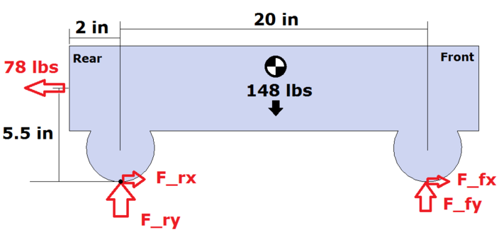 This may help because once you have 1 wheel slipping, it kind of screws up the rest of the experimental set up. Let's suppose the weight of the robot is 100 lbs, that your wheels have a static CoF of 1 and a dynamic CoF of 0.5, and that your wheels are not chained together. If your front wheels are supporting 20 lbs each and your back wheels 30 lbs each, then your front wheels will begin to slip early on and go from 20 lbs of tractive force down to 10 lbs of tractive force. Then since those are already slipping, your back wheels will both have 30 lbs of tractive force just before they start to slip, but that will only give you a total of 80 lbs of tractive force. If you were to chain your wheels together in this example, you would get 100 lbs of tractive force. This wouldn't solve weight distribution issues side to side, but it is a very easy and simple way to solve the problem front to back. |