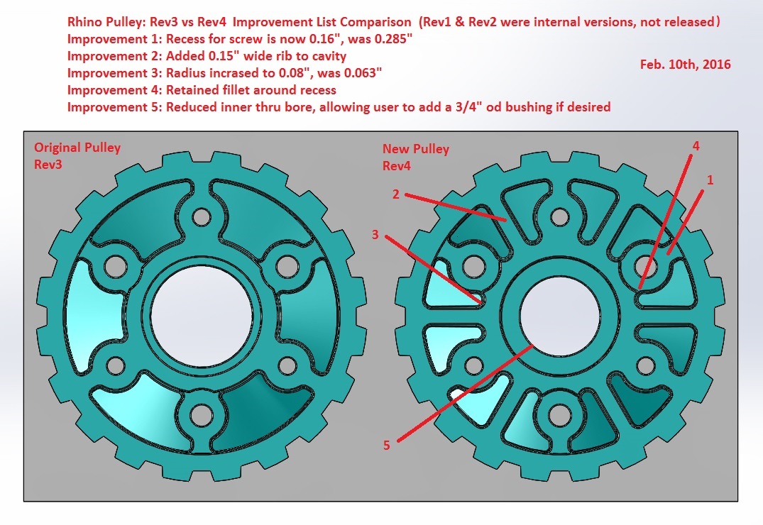 Here is a picture showing our pulley improvements for Rev4. The guys working on mold said that they were working on adding the ribs yesterday, so this change is progressing well. We should see new parts in a couple of days. ![]() Also, we are keeping a log and summary of what all is happening on this web page. At this time, we have contacted (emailed) all of the customers who have contacted us regarding this issue. So, if your team has not heard from us about this and you think that you should have, please send an email to sales@andymark.com. Sincerely, Andy Last edited by Andy Baker : 10-02-2016 at 12:45. Reason: typo in picture |