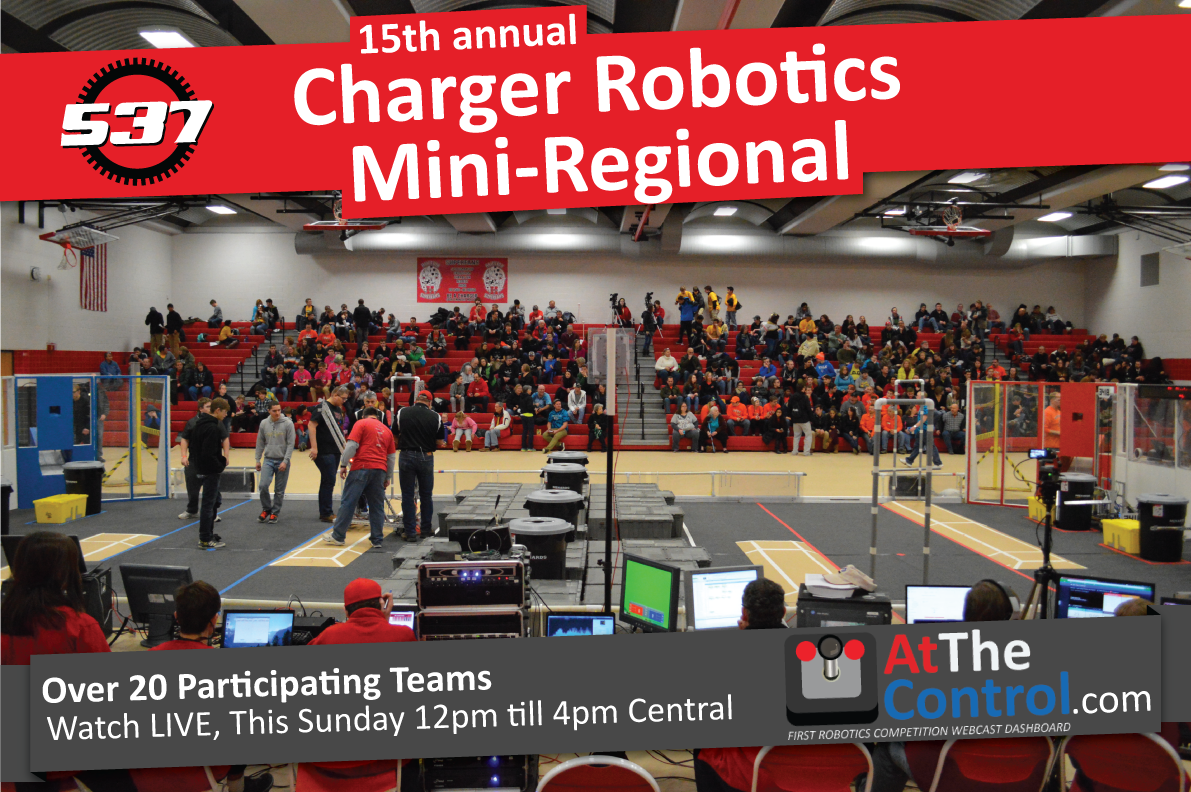 Watch the 15th annual Charger Robotics, Team 537 mini-regional LIVE starting at 12pm to 4pm central time.