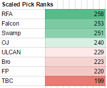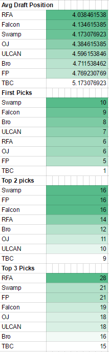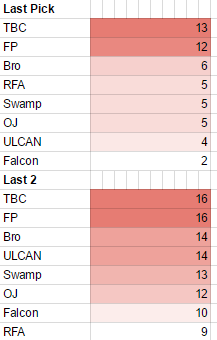 Teams that were kicked/withdrawn from the league were factored out eg. if the draft was 1. Team that got kicked out/withdrew 2. Team that is still in The team bumps up to #1 pick position. Districts aren't included cause it got swapped around. ![]() ![]() Weighted rankings 1st pick = 8 pnts 2nd pick = 7 pnts 3rd pick = 6 pnts ..... .... 8th pick = 1pnts ![]() Last edited by BrennanB : 27-03-2016 at 16:10. |