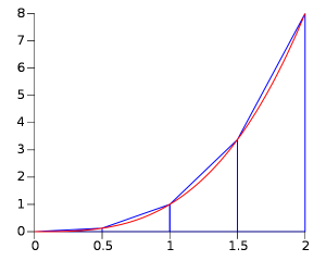 Most of you probably haven't been following this thread (warning it's a long one) Comparison of DIV MAX OPRs. In that thread, there is a lot of good analysis of Newton and the CMP Divisions. One is by Yours Truly. In that posting, I have the following chart: ![]() If you look at the chart, there are a few things that catch my eye. First it looks a lot like a typical Gaussian Distribution (I did some checking, it isn't quite Gaussian but it is pretty close). Second, it has a weird bump in the top and a few wiggles here and there. These don't trouble me at all. There are lot of oddball steps in the making of divisions. It doesn't surprise me that some of those get reflected in some unexplained wiggles. Plus also, I only did 2,500 simulated Championships. Those wiggles might smooth out if I did 2,500,000 (which I am not going to do) or I might end up with slightly different wiggles if I reran the simulation. But frankly, I don't think it matters much and I didn't lose any sleep of that unexplained bump. Third, the average of the distribution is not centered around zero. THAT is weird in a way that catches my attention. Think about it. There is no reason that the way we divide up the teams should be allowed to generate divisions that, ON AVERAGE, are BETTER than the CMP Teams as a whole (we are not systematically dropping low performing teams for example). This one I literally DID lose sleep over -- not because I think it is important so much as I think it is interesting in ways the bump is not. Part of the reason I found it interesting is that even though the effect is small (+0.16 point shift using Method #1, and 0.36 point shift using Method #2) it is the kind of thing that COULD point to something being wrong with my simulation that could be hiding more fundamental problems. And that might make an insignificant shift be very important indeed. It is often the case that these types of things help me find errors in my modeling or sometimes lead to new insights into the problem that I would have have paid attention to if I were only concerned about the magnitudes. So... ...I lay in bed last night thinking about this unexplained shift. Morning found no solution but an inkling of an idea came to mind as I cut up my apples for the day (if 1 apple keeps the doctor away, what does 4 do?). I thought about the Trapezoid Rule and Integration. It is well understood that for some types of functions (specifically functions with positive second derivatives in the range of interest) the Trapezoid Rule over estimates the area under the curve. Here is a graph that helps show why (image source): ![]() The trapezoids have a little area they count that is not quite under the curve in these cases and that causes a systematic over estimate of the area under the curve. I was doing integration. Was that my problem? I thought and thought and decided that it wasn't the source of this bias. BUT... Then it came to me. The Percentile Function that I was so blithely using in my Excel simulation, what about that? Yes. That is it!!! (at least I think so). My method has me calculate the Nth Percentile Max OPR for the 75 team Division as well as the Nth Percentile Max OP for the 600 team Championships. I generate these values in tables and then do the subtraction. It will not surprise you that my table has 100%, 99%, 98%, ... , 50% in the left hand column. Excel is a great (and terrible) program and so it is perfectly happy spitting out numbers to the right of these whole number Percents under column headings like Div0, Div1, ... , Div7, AllCMP. Think about what Excel is doing. In the case of the AllCMP life is easy for Excel. I ask it to give me the 97th Percentile team and it says to itself, 600 teams in the range AllCMP, 97th Percentile? No prob: that is just the 18th highest Max OPR (1-0.97)*600 = 18. In the case of the 75 Team Division, the 97th Percentile Max OPR is not on the list because (1-0.97)*75=2.25. Excel has to ESTIMATE that by taking the 2nd best Max OPR (which the 97.333rd Percentile) and the 3rd best Max OPR (which is the 96th Percentile). How does it do the estimate? From Excel Help: Quote: