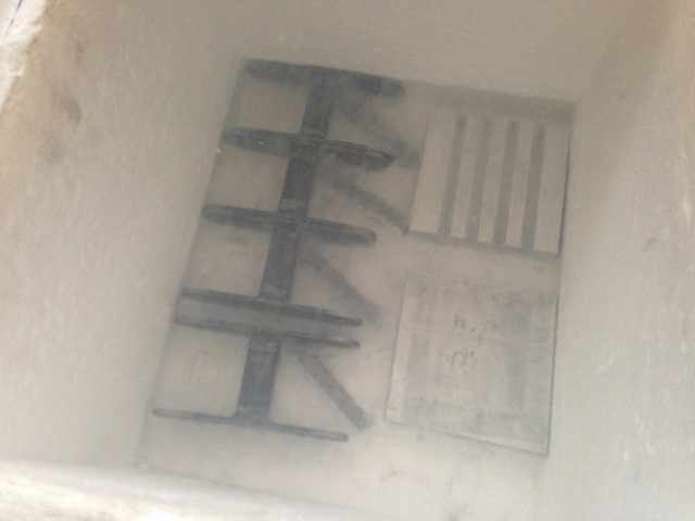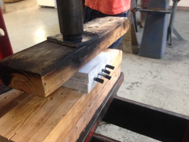 Step two: Stretch each o-ring section and place it in the V die and quickly press it. It will then freeze into the deformed triangle shape. Work fast otherwise the o-ring may freeze round preventing it from being deformed properly without cracking. This was a three person job, one to stretch, one to close the die, and one to operate the press. Wood was used to help insulate the aluminum dies.