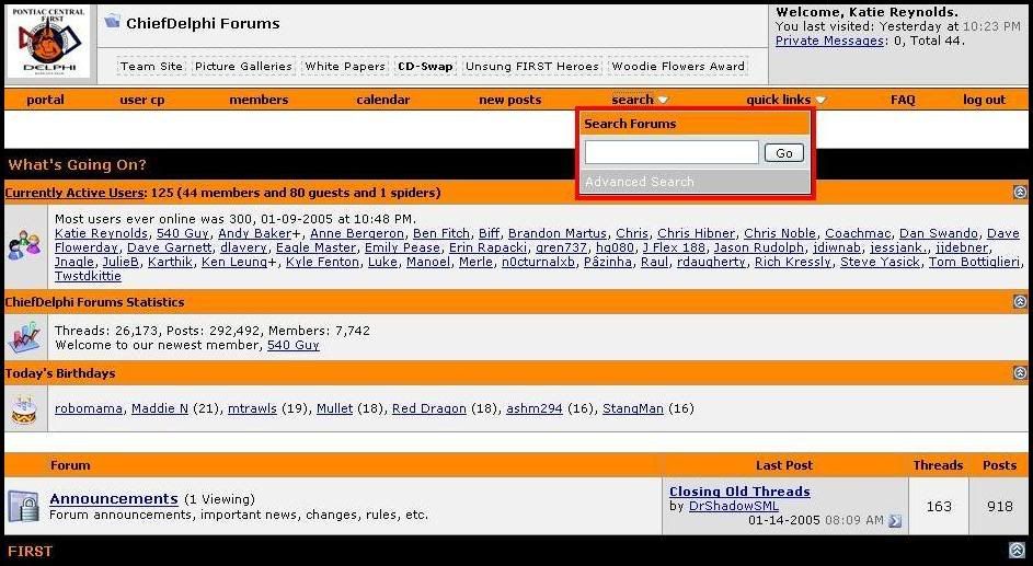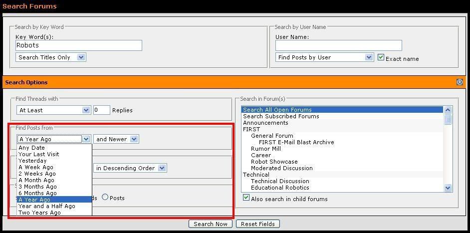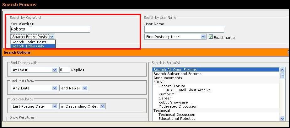 I know searching takes time - and it's a heck of a lot easier to just to make a new thread and ask your question - but during the build (with so many new threads popping up) it gets really frusterating when you have three threads concerning the same thing pop up in a matter of a days. Knowing how and what to search for is pretty hard; especially if you're a rookie in FIRST or on ChiefDelphi.com. So here's a quick "searching tutorial" Obviously, the first part is to find the "search button" It's on the orange toolbar, next to "new posts" and "quick links". When you click it, a drop down will appear and you can type in a few words for your search. Let's say I want to find a thread. I'm not sure exactly what the title was, but it had something to do with cool robots in 2004, and was made sometime in the last year. If I enter "robots" in the "search" drop down, I get 500 threads that mention the word "robots" somewhere in that thread. That's quite a few more than I want to search through. Typing "cool robots" also gets me 500 results. So, instead of just typing my search in the drop-down, I'm going to click "Advanced Search" in that same window: ![]() This will open a new page that gives me many more options to refine my search. For example, I can search just the titles of posts for "robots": ![]() This cuts the number of threads in half; there are only 202 threads with "robots" in the title. Again, that's still more than I want to search through, but I'm not going to give up just yet; I know the post was made in the last year, so I'm going to try searching by the date: ![]() Still, I get 50 results. This number is a bit more managable; I can look through the titles of 50 threads pretty quickly. But I want to narrow it down even further. On the right side of the search page, I can "Search in Forum(s)" ... First, I have to try and figure out which forums would be good to put a thread about cool robots in. My guess would be 'General Discussion', 'Robot Showcase' or 'Chit-Chat'. To select more than one forum, hold down the CTRL key and click: ![]() Now, there's less than a page of threads. If I wanted to keep narrowing it down, I could choose one or two of the forums; the less forums chosen, the fewer the results will be. Of course, you might also miss your thread if you don't choose enough forums. For me, 23 thread titles are definitely searchable. Scrolling down, I see the thread "coolest robots" - made by "Solace" with the last post on June 14, 2004. This is the thread I was looking for: ![]() If I wasn't typing all of this while I was searching, the search would have taken under 5 minutes. A new post asking, "where's the 2004 cool robots thread?" wouldn't have to be made, I found the post I wanted - everybody wins! Searching is your friend - try it. ![]() |