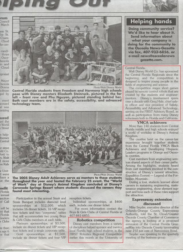 It's definately awesome to be part of the Disney alliance, the sponsor alot of teams around this area. Good job to 1402 and 1604 for making the paper and Michelle for sharing the information with the community. You guys rock. =]
