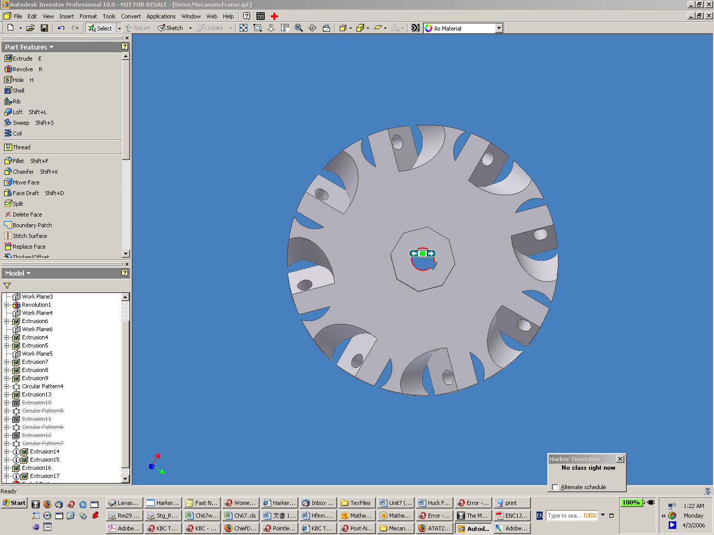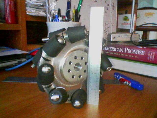 Went milling today, got the wheels done. Here are some pictures. They still need to be cheeseholed, but meh. we've 7 more to go! (sorry for low-res, taken on my camerafone) Blanks http://i27.photobucket.com/albums/c1...456/Blanks.jpg Initial setup http://i27.photobucket.com/albums/c1.../MillSetup.jpg Closeup of the jig http://i27.photobucket.com/albums/c1...tupCloseup.jpg First cut http://i27.photobucket.com/albums/c1...6/FirstCut.jpg Second cut http://i27.photobucket.com/albums/c1.../SecondCut.jpg Assembled http://i27.photobucket.com/albums/c1.../Assembled.jpg ![]() (NB - the steel rule is a 6" scale) We didnt really NEED a mill, we could have done this with a drill press =p. As long as you can get the blanks, you can make these mecanums with a drill press and bandsaw. but a mill is nice =p. Last edited by Tatsu : 19-04-2006 at 23:03. |