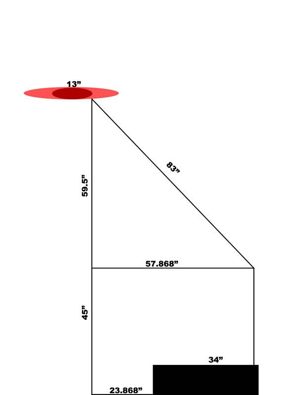 In the following example, I'm going to lay out a few assumptions to make the problem simpler. The scoring bot is a 37"x27" bot, with an un-turreted arm projecting from the 37" dimension. The arm is 4" thick, is 83" long (center of rotation 3" from the rear of the robot) and therefor projects 49" when parallel to the ground from the front of the robot to the front of the end effector (about .3" from the maximum allowed value in this problem, using the hypotenuse 101.823" hypotenuse of the 72"x72" size allowment). The arm has a shoulder joint (and point of rotation) 45" off of the ground. The arm is designed to score the tubes parallel to the ground, and has a wrist joint to keep them parallel through-out the rotation of the arm. The end effector uses one of the sides of the tube to manipulate it, projecting the rest of the tube forward from the end of the end effector. Now, we plug all these fancy numbers into a calculator, and figure out how far the robot can be away from the rack to score on each level, and we get these numbers back. Low spider- 61.388" Middle spider- 58.473" Top spider- 36.868" (For more info on how I calculated these number, please consult the illustration below demonstrating the example for the Top Spider, including clearance height for the entire spider foot, stinger, and bottom half of tube) http://img.photobucket.com/albums/v1...titled-1-2.jpg Beyond that, all of those reach numbers could be even greater if the robot had a higher point of rotation, and/or a turreted arm (allowing for a longer reach from the frame while remaining in the 72" x 72" size limitation). Given the same arm and base constraints (4" thick arm, 27"x37" base, with the center of rotation 3" away from the end of the 37" dimension) the "holy grail" arm design (360º turret, with a point of rotation at the height of the top spider) you could in fact score from ≈76" away without violating the 72"x72" rule. Note, this the first design not an easy design either (especially making an 83" long arm fit in the 48" starting height), and would probably either require a multi-jointed arm and/or a telescopic arm. But this shows that a 48" robot, with an un-turreted arm can score over the short dimension of a defender at all 3 levels of the rack. Now, granted, it does not mean that these bots are undefendable, far from it. They still may be able to be pushed away, or rotated out of scoring position. Additionally, if the defending bot is tall enough (or has an arm that can extend high enough), they may be able to block the tube from being scored. Last edited by Lil' Lavery : 12-02-2007 at 17:48. |