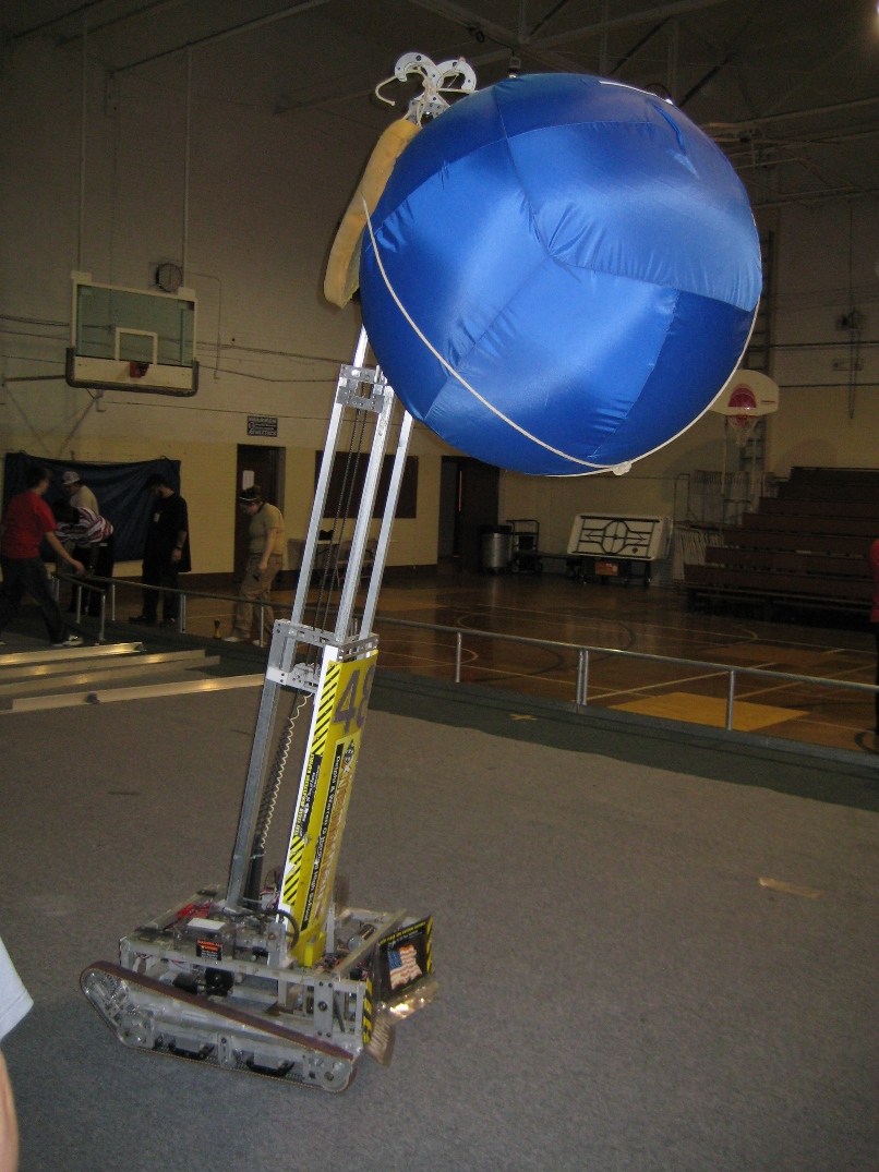 This arm's tilt feature lets you reposition the ball over the bot's pivot point quite nicely for transport. The extension stage was designed to lift the entire weight of the robot off the ground, and therefore, it easily and quickly handled the lifting of the ball. Even the lil' ol Globe motor-driven hook stage had enough oomph to elevate the ball further....at a snail's pace.