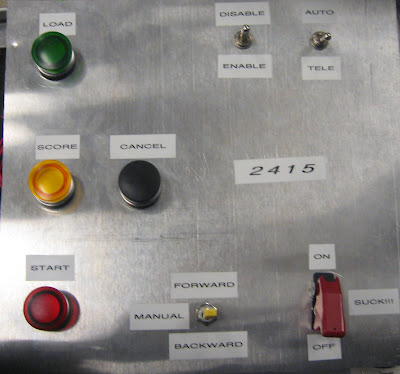 Here is our new control system for the arm. We have 3 preset positions for our arm. A cancel button incase something goes wrong(not the code). We also have a manual override for finessing the suction cup. A switch for the vacuum of course. And we also have disable and auto switches for testing.