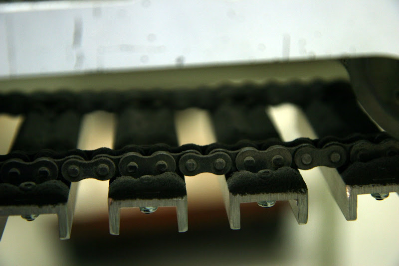 Thy consisted of aluminum C-stock fastened to chain that had special links that allowed things to be attached to them without modifying the sprockets. you can find them here: http://www.mcmaster.com/#roller-chain/=6s0umt Scroll down to the bottom and click on accessories. Unfortunately, they're only available for 35 pitch chain.