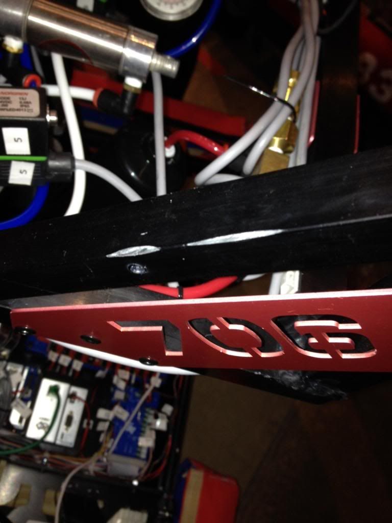 ![]() You can see that piece of square tubing is supposed to be parallel to that ruler and is bent in about 2 inches as well as having the end 3 inches bent down about an inch with the rivets ripped out and the belting torn off. We also had our ball centering device which is a piece of .125 by 3 inch piece of aluminum and is well within our frame perimeter bent at almost 90 degrees over the last 3 inches. No pic because we were in finals and had no time to waste. Was a lot of fun though also had metal sheered off as seen in this pic. ![]() Build em strong this year!!!! |