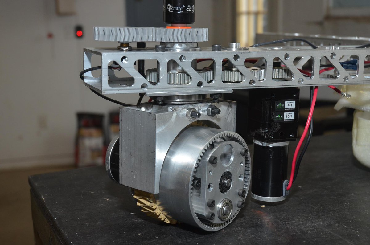 Second thing I can see is the massive coaxial-style top piece. How is it attached to the cim/wheel assembly? Also, whydid you choose to place gear at the top as opposed to a sprocket or pulley? I assume the wheel is custom. Is it riding on a bearing or a bronze bushing or a plastic bushing? Last thing: speed and weight. What are you geared for, and how much does the shown stuff weigh? You should try for 15fps+ to maximize usage of your 4 cims. As for weight, it's really your call, but I like my swerves to be less than 9lbs as a general rule of thumb. Very nice swerve drive. I like the use of a planetary there. I recommend QTC gears for the ring gear, or even a AM gem ring gear (because it's only $10 and it's hex shaped!). Also, check out this article from QTC on internal gearing: http://www.qtcgears.com/Product-Tech...nformation.htm It explains the three types of interferance you should seek to avoid, and the number of teeth you need on the planet gears to avoid them. Last edited by asid61 : 04-11-2014 at 00:34. |