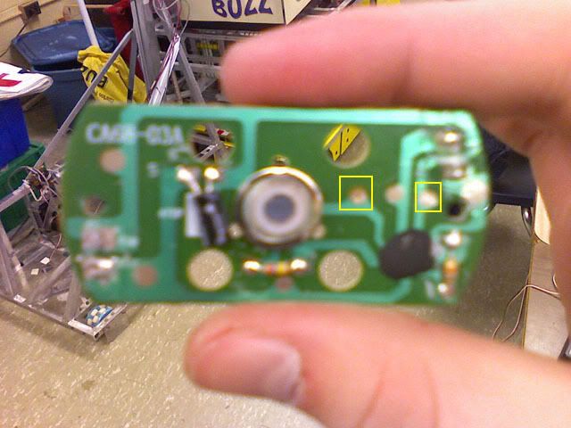 Here is the front of the BaB board, and the two highlighted points are where you need to connect the two wires you previously attached to the EB board to. Again, either cable can be attached to either point. These points are a bit closer together though, so do be careful when soldering them.