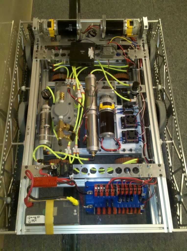 Not concerned about being pushed around too much. The dewalts in 2nd gear are a pretty even match with this year's KOP gearboxes. The 2 motor drivetrain in 2nd lacks pushing power, but ideally we'll be quick enough to avoid the situation. In first gear, pushing back shouldn't be an issue. Here's a video of our early prototype: http://www.youtube.com/watch?v=mu5OeR3HkW8 and a better view: ![]() We're very fortunate our sponsor, Nypro, provides the room for a near-competition size field. |