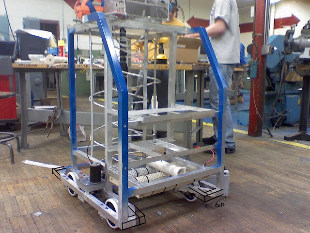 Bumpers go on next, they fit the restraints of the bumper rules... The bumper in the front will actually be ONE piece with the side. So it will wrap around, because the rules say it has to be a minumum length...We will have three pieces total.... one on the rear, and two pieces that make up the sides and front part, still allowing the balls to be sucked in... We are in no way finished, we are here right now @ 10pm on the 6th