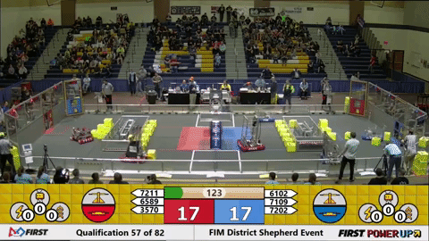 Qual 57 FIM Shepherd: 3570 (on red) scores on the blue side of the scale. Eventually almost scores a second cube before realizing the mistake.